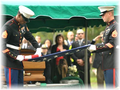 Later, as the procession rolled across town to Oaklawn Cemetery, motorists stopped on cross streets got out of their cars and saluted. Closer to the cemetery, people lined the road, holding their hands over their hearts and waving flags.
